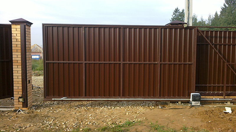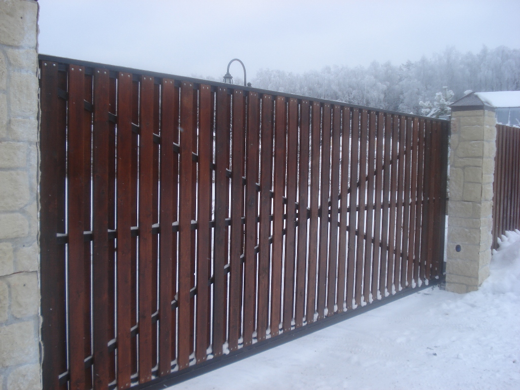 Откатные ворота могут быть смонтированы с любым заполнением: профлист, евроштакетник, дерево в различных исполнениях и т.д. А подключение систем автоматического открывания ворот сделают Вашу жизнь еще более комфортной!